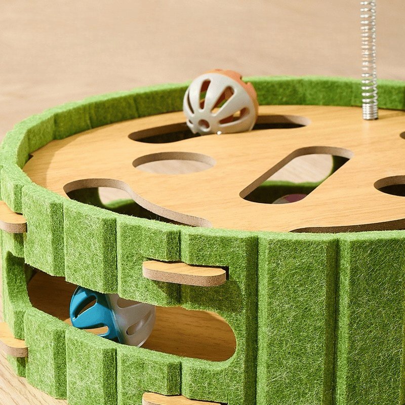 Dieses hochwertige Katzenspielzeug kombiniert Spielspaß, Bewegung und Krallenpflege in einem. Das stabile Labyrinth aus Holz und Filz enthält drei Kunststoffbälle mit Glöckchen, die deine Katze durch die Öffnungen anschubsen und jagen kann. So wird der Jagdinstinkt gefördert, Langeweile vertrieben und gleichzeitig die Geschicklichkeit trainiert.